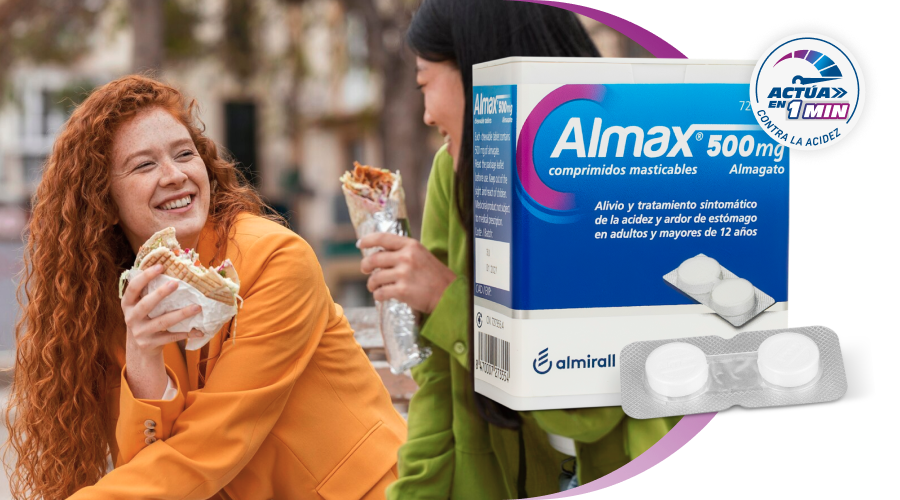 Almax actúa en 1 minuto contra la acidez, sin importar lo que comas.